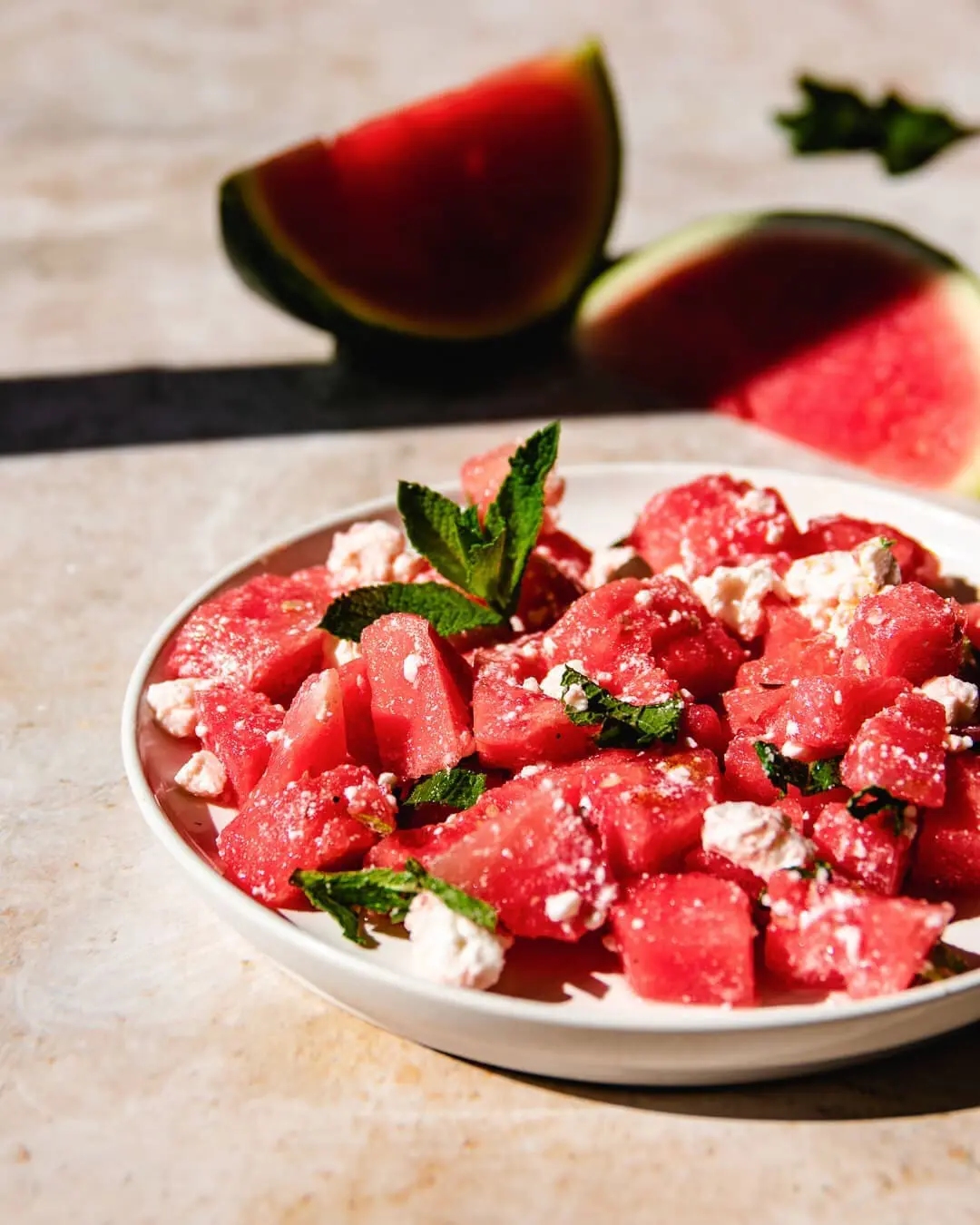 - Meng de watermeloen met de feta en munt. Dien op in een schaal of een bord. Sprenkel nog wat olijfolie eroverheen en breng op smaak met een beetje peper.