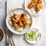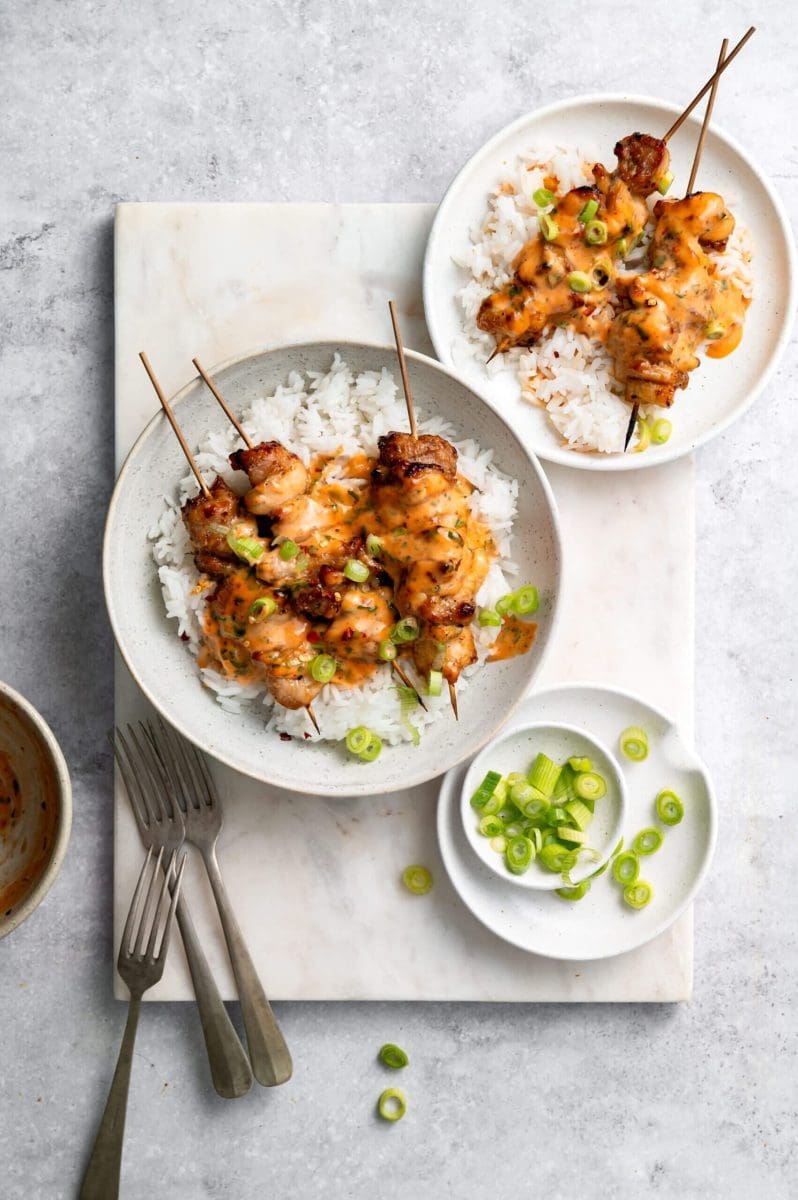 Dien de kipspiesjes op met gekookte rijst en de saus en garneer met de bosui.