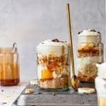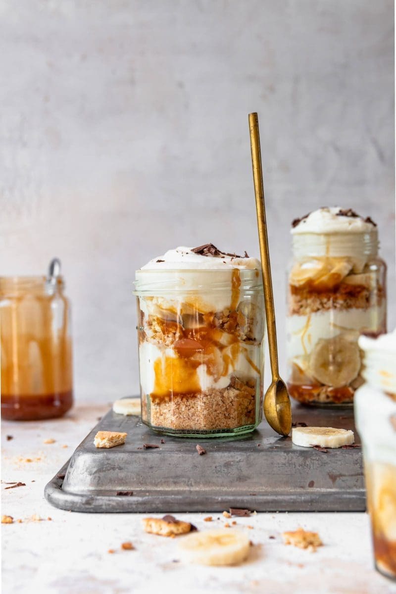 Vul de bakjes eerst met een laagje koek, dan karamelsaus, banaan en slagroom. Herhaal 2 a 3x totdat het bakje vol zit.