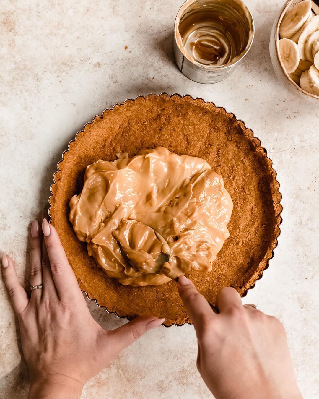 Vul de bodem voorzichtig met de dulche de leche. Wanneer dit helemaal is afgekoeld kan het best uitharden. Warm het dan eerst even op wanneer je het op de taartbodem doet, anders heb je kans dat je de bodem kapot maakt.