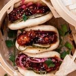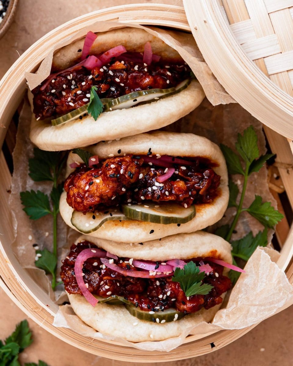 Dien de bao op met ingemaakte komkommer, de kip en ingemaakte rode ui. Garneer met sesamzaadjes en verse koriander.
