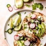 Verdeel wat creme fraiche over de tortilla en vul met vlees, avocado, radijs, jalapeno, feta en koriander. Serveer met limoen.