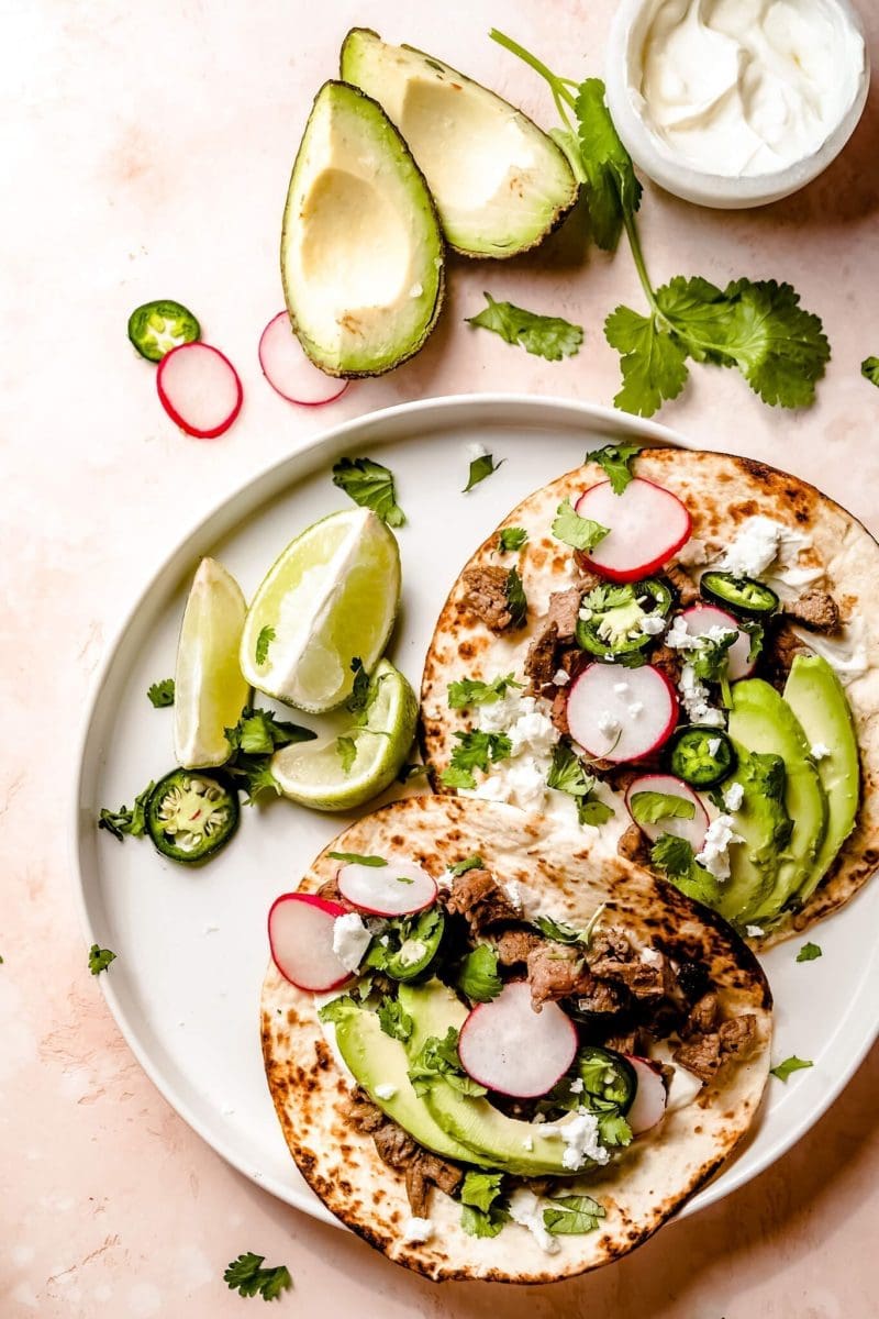 Verdeel wat creme fraiche over de tortilla en vul met vlees, avocado, radijs, jalapeno, feta en koriander. Serveer met limoen.