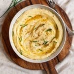 Serveer over 4 a 6 porties (afhankelijk van hoeveel trek je hebt), verdeel nog wat de overgebleven roomboter over de puree en garneer met versgemalen zwarte peper en verse bieslook.