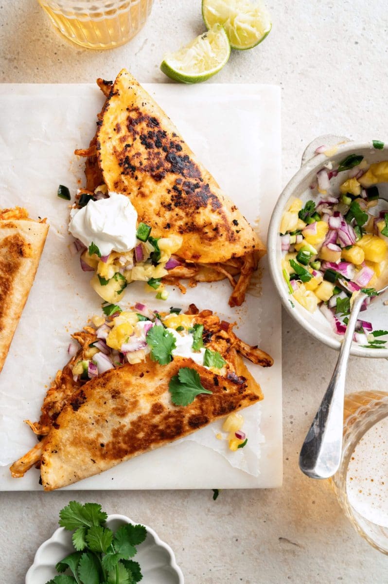 Verhit een klein beetje olie in de pan, voeg de tortilla toe en verdeel wat geraspte kaas en kip over één helft. Laat even bakken op laag vuur tot de kaas gesmolten is en de tortilla goudbruin en vouw dubbel.