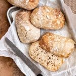 Bebloem een aanrecht ruim en kiep het deeg hierop, hiervoor vetten we de kom in zodat het deeg makkelijk loskomt. Blijft het toch plakken, gebruik dan je deegschraper om voorzichtig uit de kom te halen. Je wil hier het deeg niet platslaan/drukken en alle lichtbellen eruit drukken waar we net zo hard voor gewerkt hebben. Vorm in een vierkant en snij dan in 6 stukken.