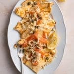 Serveer met de gerookte zalm, de geraspte kaas, de kappertjes en een schijfje citroen.
