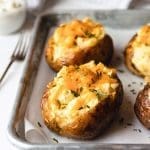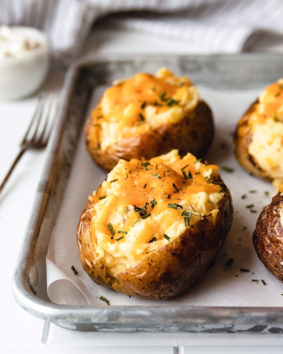 Vul de aardappel schillen met de puree, verdeel nog wat cheddar over elke aardappel en bak nogmaals af totdat de cheddar is gesmolten, zo'n 5 a 10 minuten.