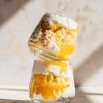Je kunt eventueel fruit toevoegen tussen de lagen, ik zou voor iets zuurder fruit gaan zoals aardbeien of bessen.