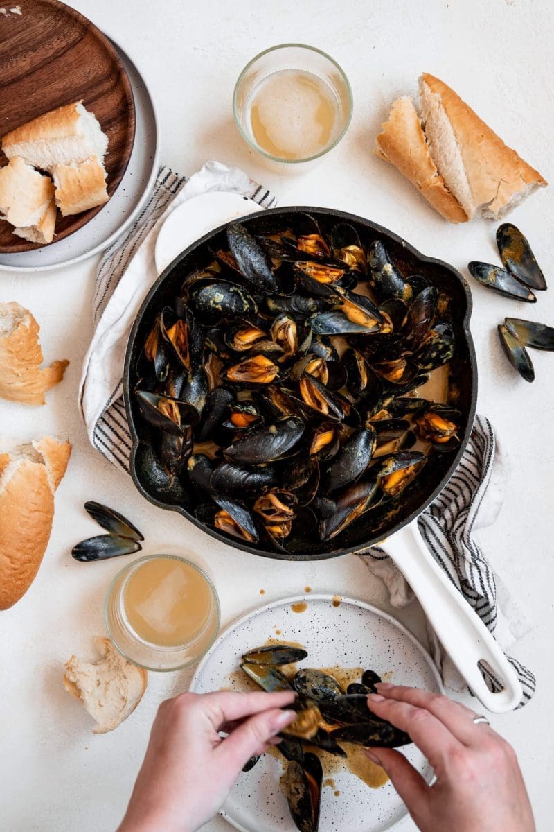 Voeg de mosselen toe en laat met deksel op de pan 3 à 5 minuten gaar stomen. Hussel af en toe door.
