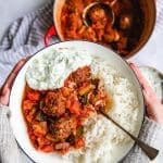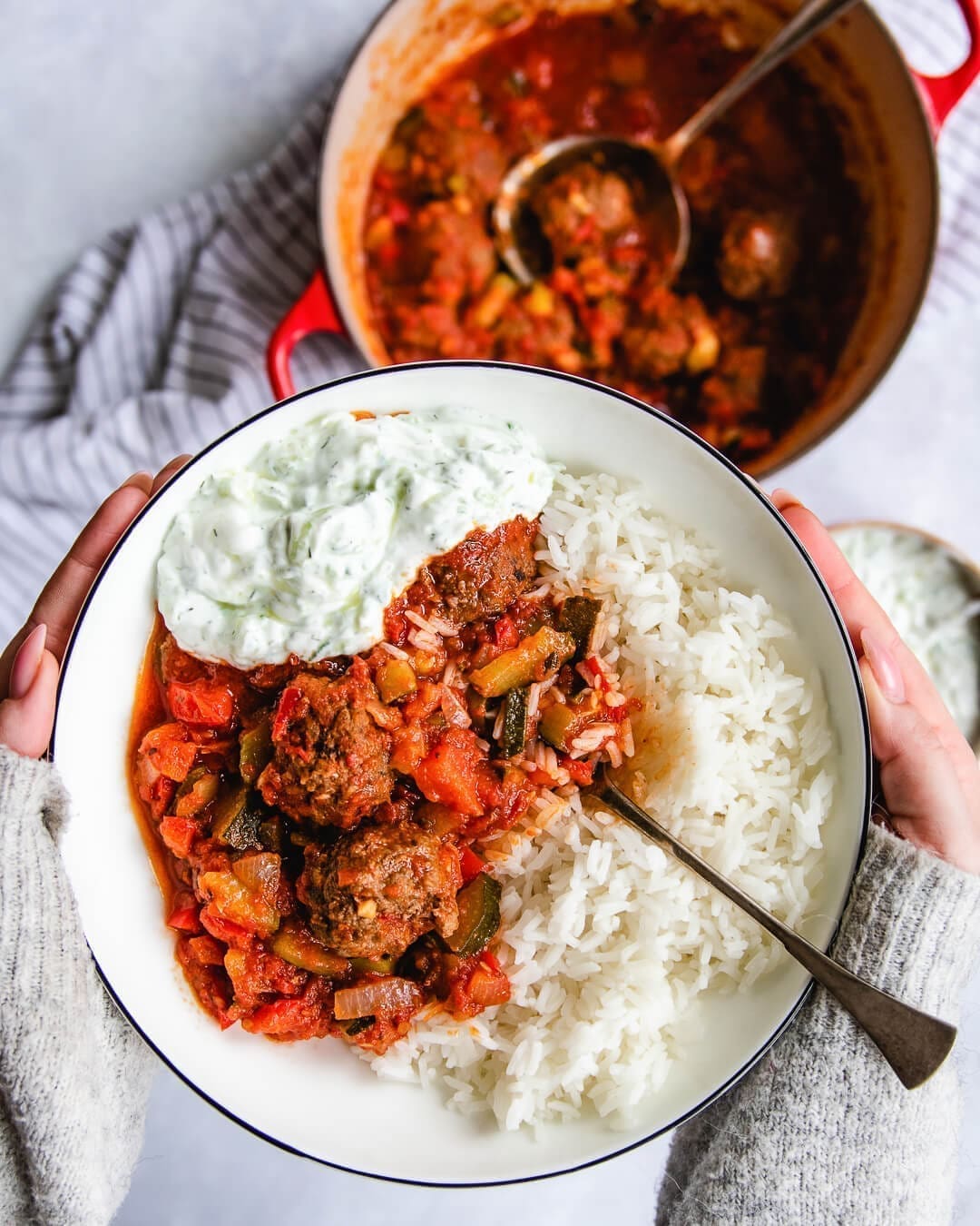 Proef op het einde of de saus nog meer op smaak moet worden gebracht met peper en zout. Serveer de kofta met witte rijst en tzatziki.
