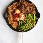 Voeg de eiermie toe en de ketjap. Meng totdat alles mie goed bedekt is. Serveer direct.