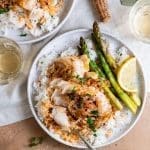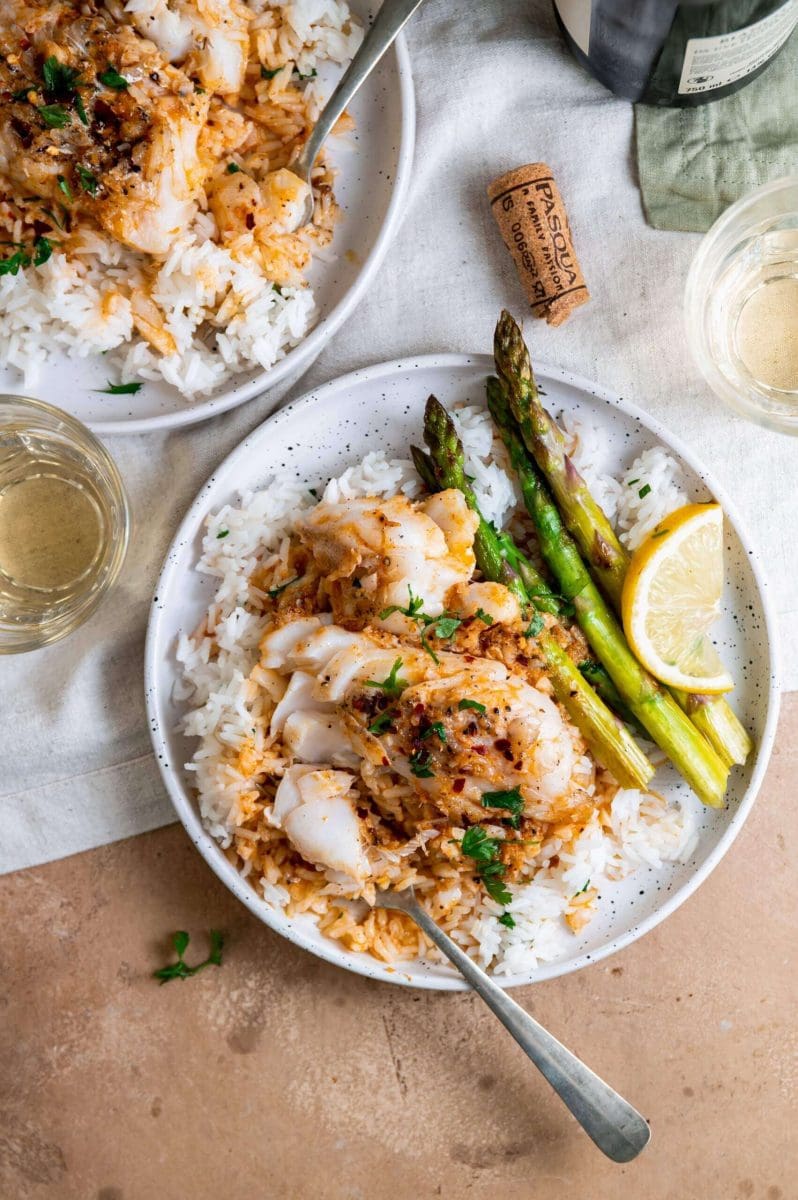 Dien de rijst op met de asperges. Leg de kabeljauw op de rijst en verdeel de saus over de 2 borden. Garneer met wat verse peterselie en chilivlokken.