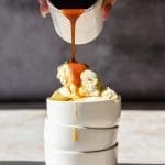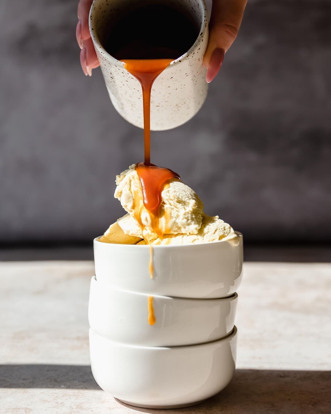 Raak niet in paniek als de caramel opeens stolt in de slagroom. Wanneer de slagroom heet is mengt het allemaal weer netjes. Wanneer alles goed gemengd is laat je de karamel in het pannetje een beetje afkoelen. Giet daarna over in een flesje en bewaar in de koelkast.