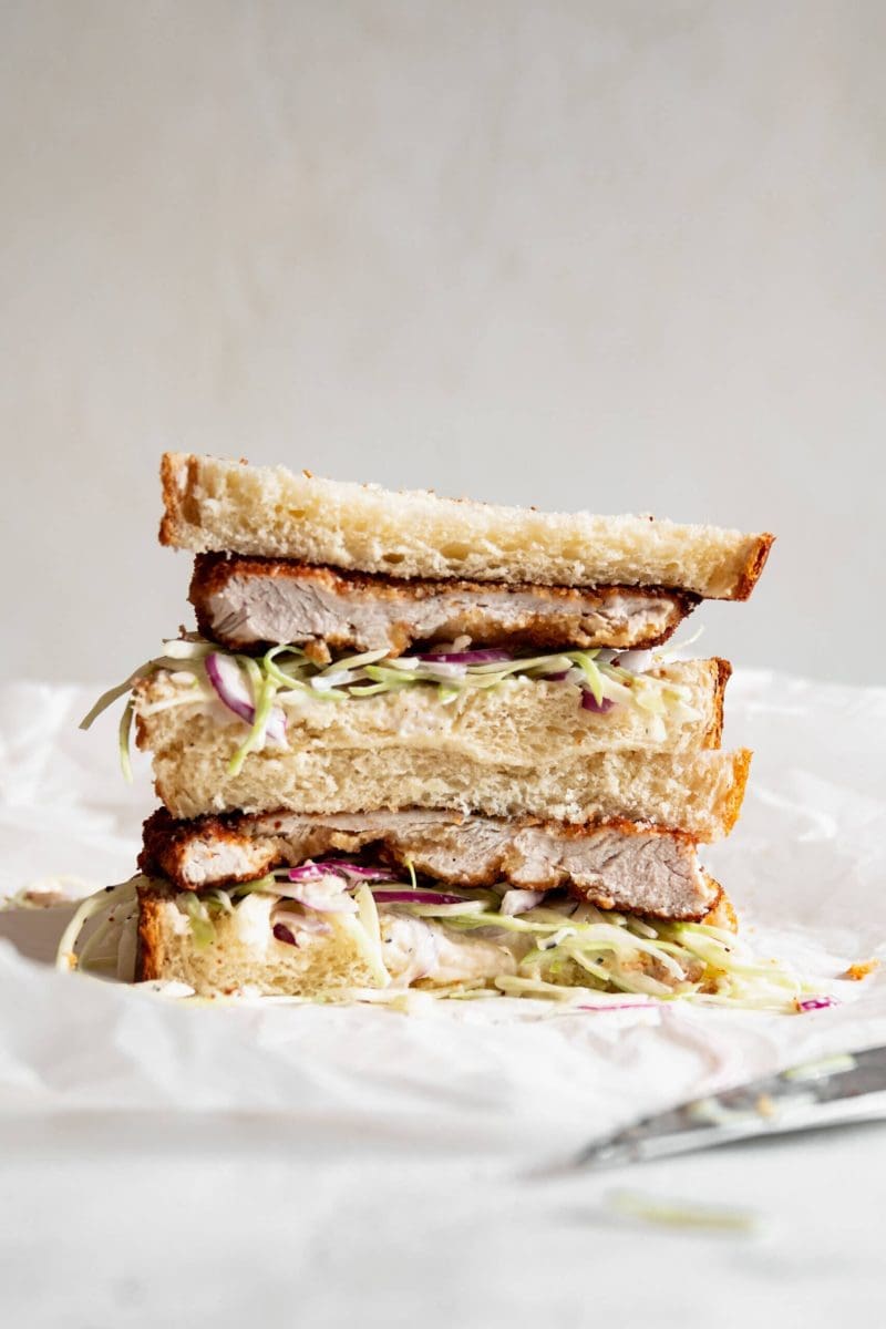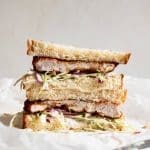 Smeer het brood in met wat okonomi saus, verdeel (naar smaak) de koolsalade hier overheen en leg de gebakken kip erop. Sluit af met de 2e snee brood en snij diagonaal door midden. Serveer direct.