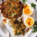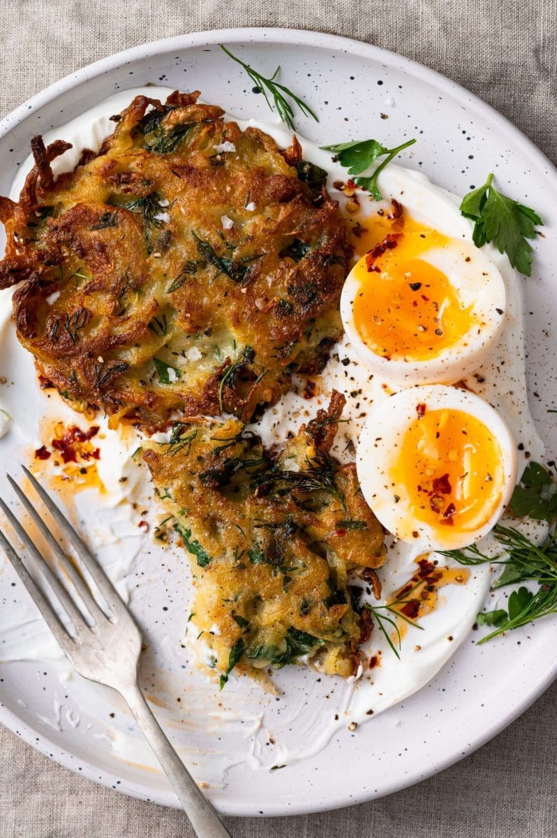 Verdeel de yoghurt over 2 borden en druppel wat van de chiliolie, hoeveelheid naar smaak, hieroverheen. Leg er 2 latkes bij en het gekookte eitje. Garneer met verse dille en peterselie.