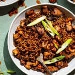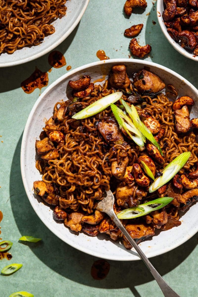 Verdeel over 2 borden, garneer met bosui en cashewnoten (hoeveelheid naar smaak). Serveer met de cashewnoten en chiliolie ernaast zodat mensen zelf kunnen bepalen of ze nog willen toevoegen.
