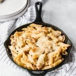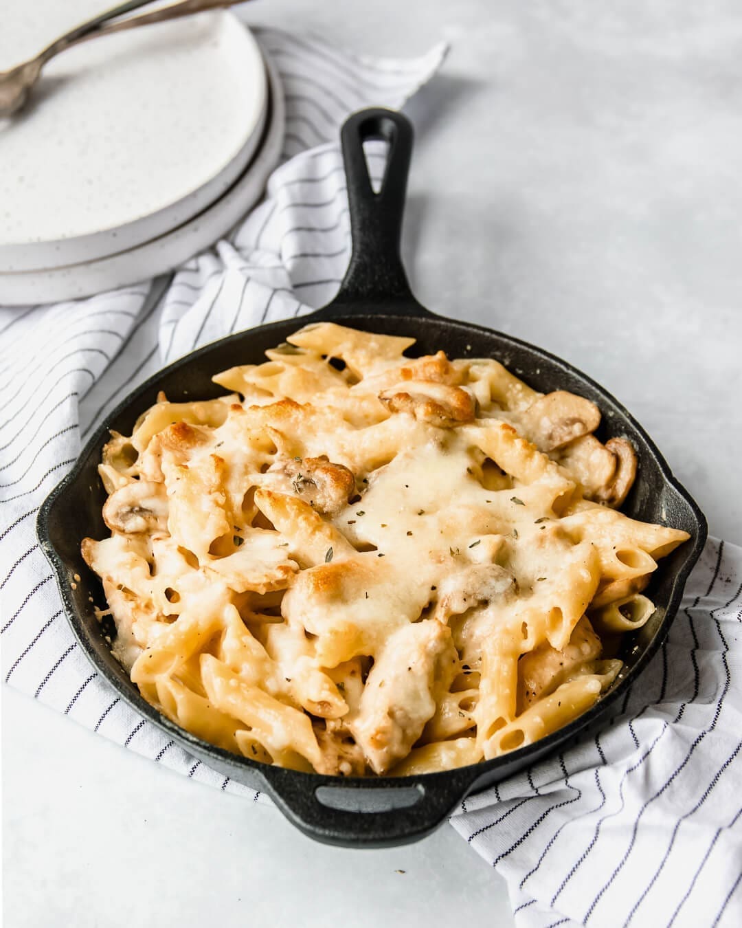 Schenk de melk in de pan en doe de parmezaanse kaas en de Italiaanse kruiden erbij. Roer door totdat de kaas gesmolten is. Doe de pene en de kip in de pan. Als de saus te dik is kan je nog wat melk toevoegen. Is het heel dun? Laat dan nog even op het vuur staan.