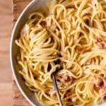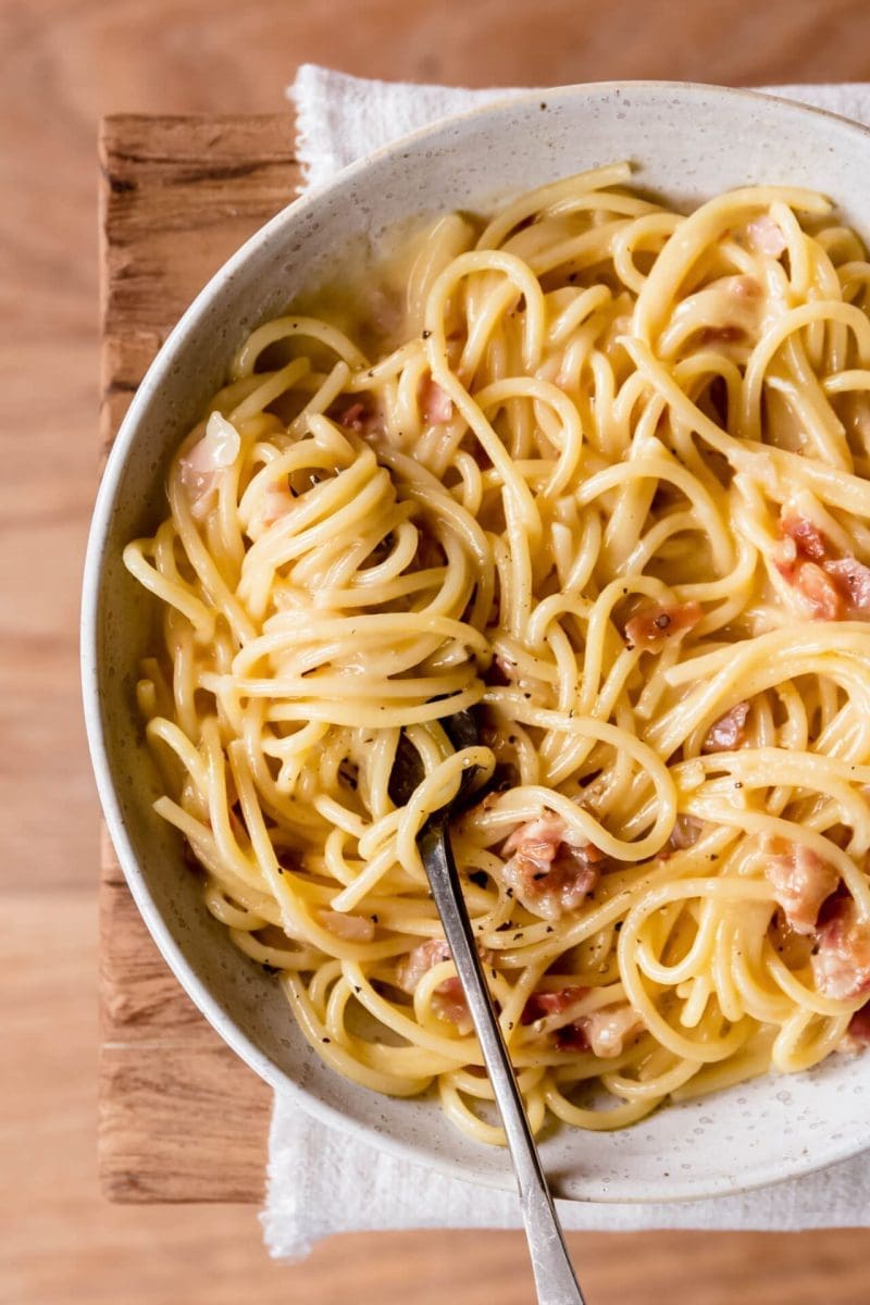 Haal de knoflook uit de pan en voeg de spaghetti toe, bewaar het kookvocht. Haal dan van het vuur af en voeg het eimengsel toe. Roer door en til de spaghetti ook op tijdens het mengen, zo glijdt de saus naar beneden en mengt alles goed. Meng totdat je de juiste dikte saus hebt bereikt, vind je het te dik voeg dan wat pastawater toe.
