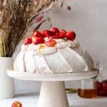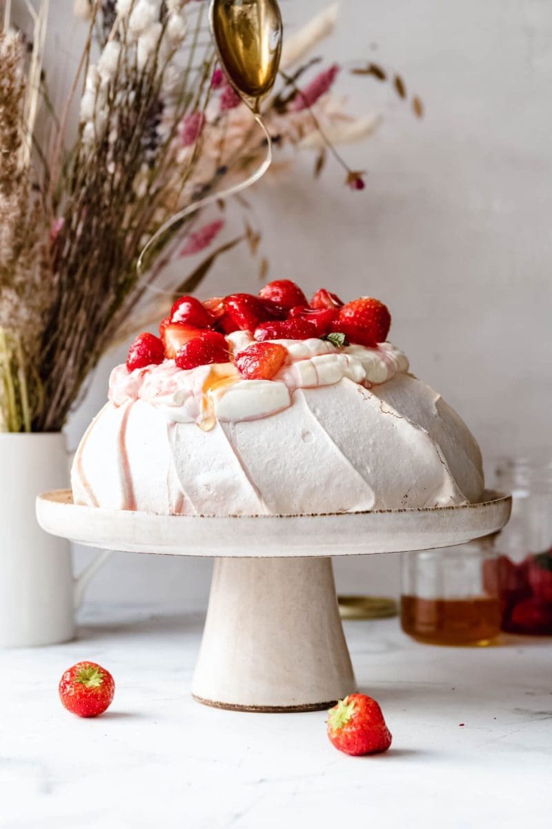 Pavlova met Griekse yoghurt, aardbeien, munt en honing