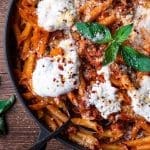 Haal uit de oven en verdeel de overige 50 gram fijngeraspte parmezaanse kaas over de pasta samen met versgemalen zwarte peper en chili vlokken naar smaak. Dien direct op.