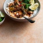 Serveer met gekookte rijst, verse basilicum en eventueel wat chilipeper en limoen als garnering. Wil je meer groenten toevoegen, dan zou ik er gekookte peultjes of sugarsnaps bij doen.