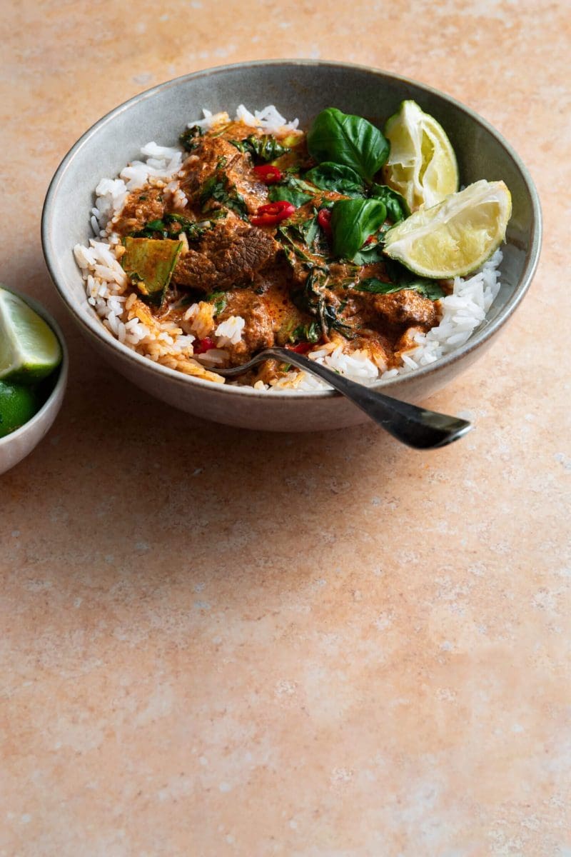 Voeg wanneer het vlees gaar is en uit elkaar valt de rest van de kokosmelk, de limoensap toe en de paksoi toe, proef of je het verder op smaak moet brengen met zout en laat zonder deksel op de pan sudderen en de saus inkoken tot de gewenste dikte.