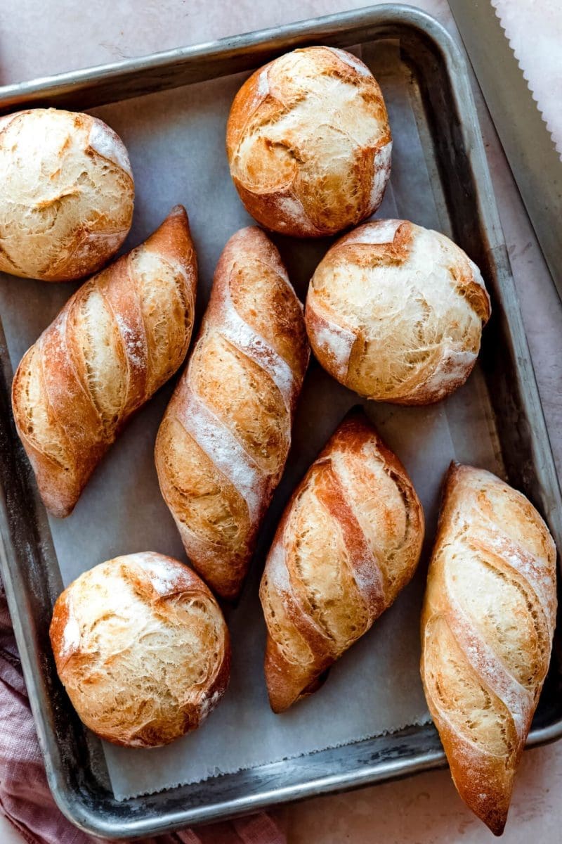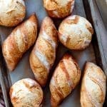 Begin na 15 minuten voorverwarmen met het vormen van je deeg. Verdeel het deeg in 8 porties van ongeveer 100 gram. Ik heb 4 pistoletjes en 4 bolletjes gemaakt, maar die keuze laat ik aan jou over. Laat de eerste 2 broodjes uit de koelkast, maar zet de rest terug in de koelkast.