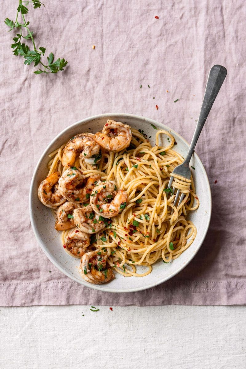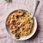 Spaghetti met garnalen in een bruine botersaus