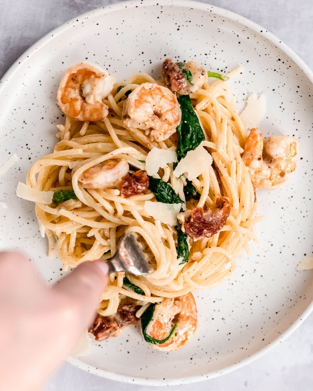Spaghetti met spinazie, garnalen en zongedroogde tomaat