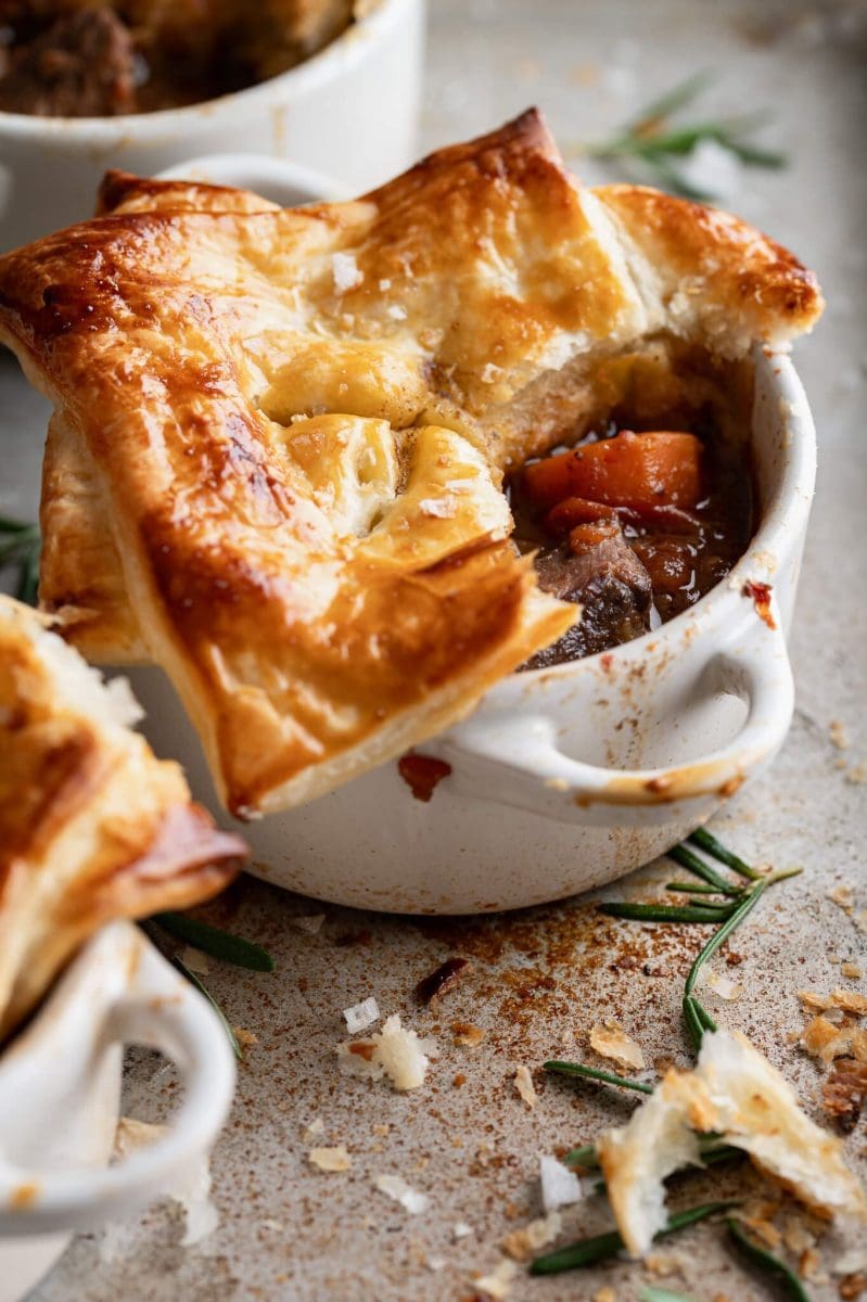 Bak 15 tot 20 minuten af in de oven, tot het bladerdeeg goudbruin is. Laat 10 minuten afkoelen voordat je de potjes opdient.