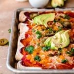 Verdeel de overige enchilada saus over de tortilla’s, verdeel dan de blokjes cheddar en de grated mozzarella naar smaak.