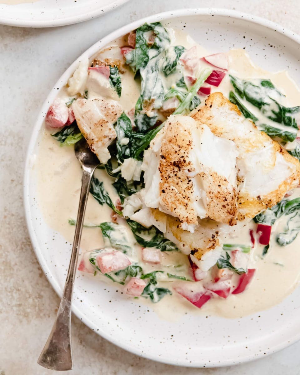 • Verdeel je spinazie mengsel over 2 borden en leg je vis daar dan weer op. Dien direct op.