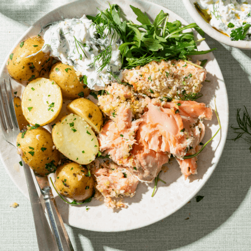 Serveer de krieltjes met de zalm en de feta saus. Ik heb er los nog een groene salade van rucola bij gedaan, maar broccoli of gebakken courgette is ook lekker.