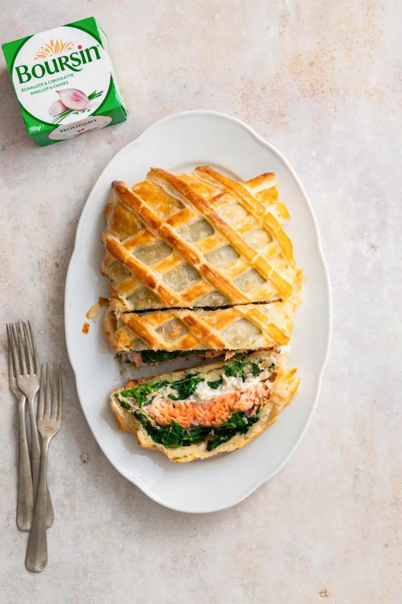 - Rol het bladerdeeg uit op een bebloemd aanrecht en verdeel de helft van de spinazie in het midden. Leg hier de zalm op, breng op smaak met peper en zout, en smeer in met de Boursin. Verdeel de rest van de spinazie hier overheen en vouw dan dicht als een pakketje. (snij eventueel de overlappende delen bladerdeeg weg, je kunt dit gebruiken om de bovenkant mee te versieren). Zorg dat alle naden goed gesloten zijn en keer het pakketje om zodat de naadkant aan de onderkant ligt.